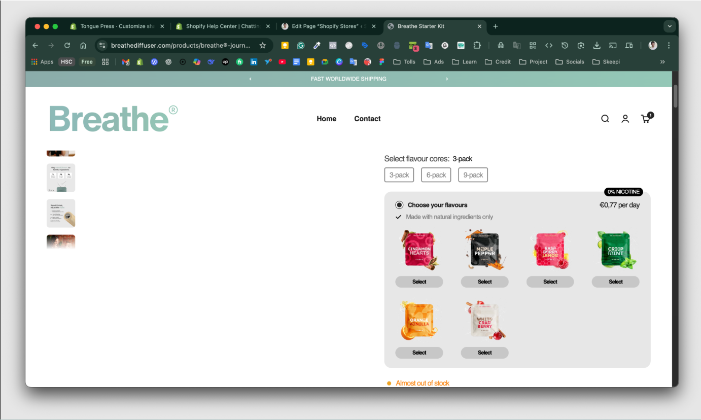 Breathe is a Shopify store developed for a distinctive vape brand, built using the Impact theme. The project focused on creating a clean, engaging, and memorable online shopping experience that reflects the uniqueness of the brand. The store features a bold and modern design, responsive layout, and well-organized product pages for effortless navigation across all devices. Special attention was given to product presentation, branding consistency, and user journey optimization to enhance customer engagement and sales. This project demonstrates the ability to customize premium Shopify themes for niche lifestyle products, delivering a polished and conversion-focused online store.